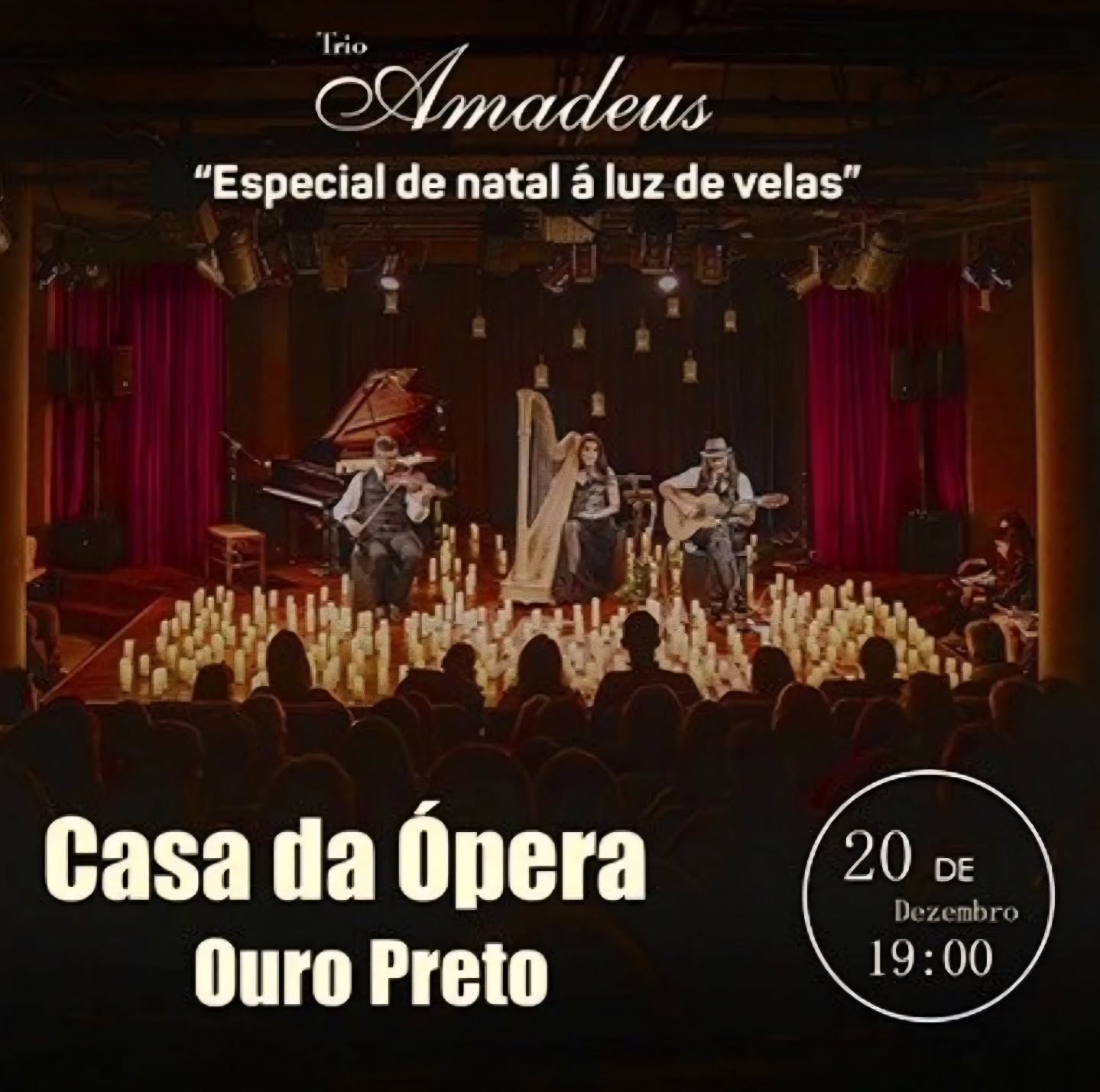 O concerto “Trio Amadeus – Especial de Natal à Luz de Velas” será realizado no dia 20 de dezembro de 2025 (sábado), no Teatro Municipal – Casa da Ópera, em Ouro Preto (MG). A apresentação integra a programação cultural de fim de ano da cidade e propõe uma experiência musical voltada ao repertório natalino em formato de concerto intimista.