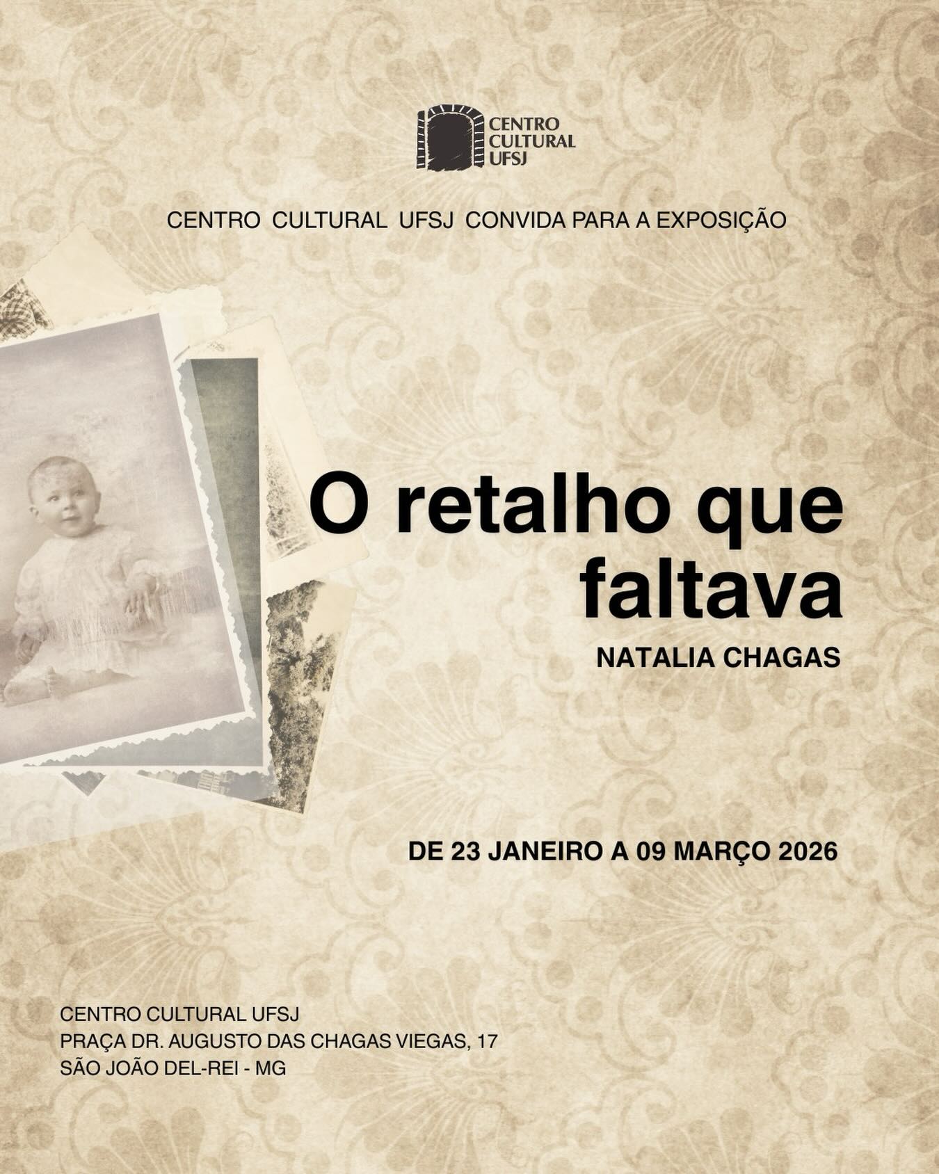 A exposição “O retalho que faltava” será apresentada no Centro Cultural UFSJ, em São João del-Rei (MG), com abertura em 23 de janeiro, às 19h. A mostra propõe uma investigação sobre a ausência de fotografias de infância e seus efeitos na construção da memória, reunindo trabalhos desenvolvidos pela artista Natália Chagas a partir de oficinas realizadas com 17 mulheres das periferias de Tiradentes.