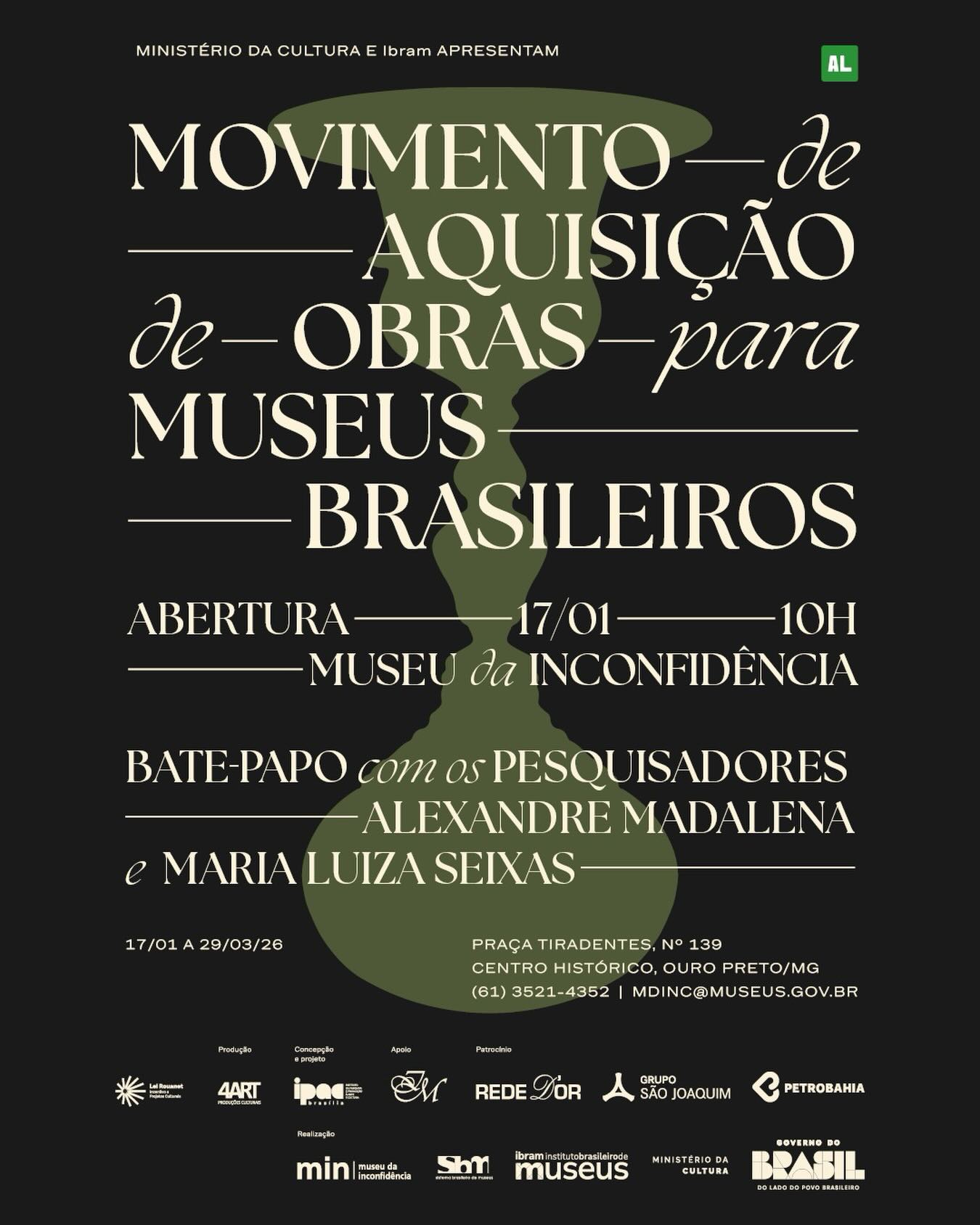 A exposição “Movimento de Aquisição de Obras para Museus Brasileiros” será realizada no Museu da Inconfidência, em Ouro Preto (MG), a partir de 17 de janeiro. A mostra é uma iniciativa do Ministério da Cultura, em parceria com o Instituto Brasileiro de Museus (Ibram), e integra uma ação nacional voltada ao fortalecimento dos acervos museológicos e das políticas públicas de patrimônio cultural.