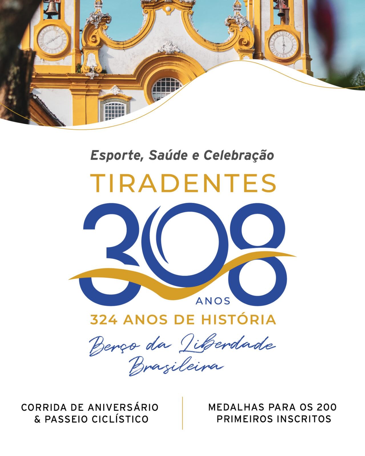 As comemorações dos 308 anos de Tiradentes acontecem nos dias 17 e 18 de janeiro, com programação esportiva promovida pela Prefeitura Municipal de Tiradentes, reunindo moradores e visitantes em atividades ao ar livre que integram o calendário oficial do município. As ações celebram o aniversário da cidade por meio do incentivo ao esporte e à convivência comunitária.