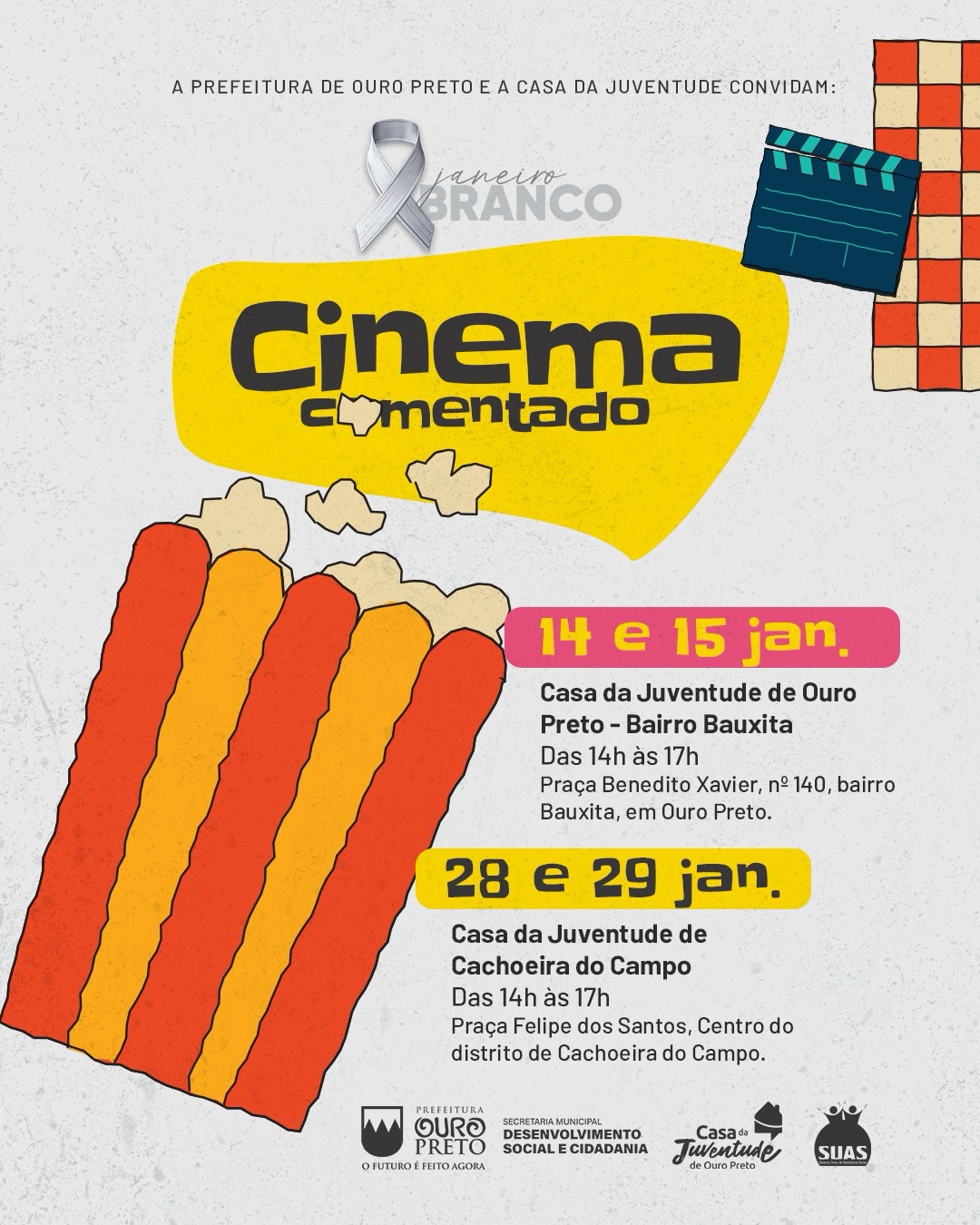 O Janeiro Branco – Sessão Cinema na Casa da Juventude é uma iniciativa que integra a Campanha Janeiro Branco 2026, cujo tema é “Paz, Equilíbrio e Saúde Mental”. O projeto utiliza sessões de cinema comentadas para promover reflexões sobre autoconhecimento, autoestima, relações sociais e bem-estar emocional, incentivando o diálogo sobre emoções, sentimentos e vivências cotidianas.