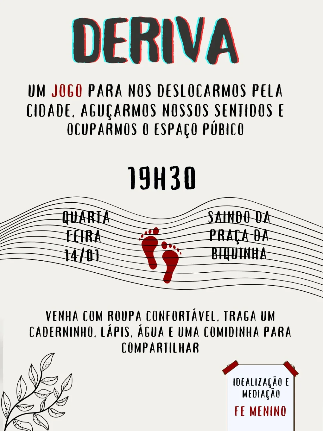DERIVA é um jogo-experiência urbana que propõe o deslocamento coletivo pela cidade a partir de cartas coloridas, em que cada cor corresponde a uma categoria de ação: movência, contemplação, brincadeira, conversa e feitura. A dinâmica parte de um ponto definido e o percurso é construído em tempo real, estimulando a ocupação do espaço público, a atenção aos sentidos e a vivência do acaso no ambiente urbano.