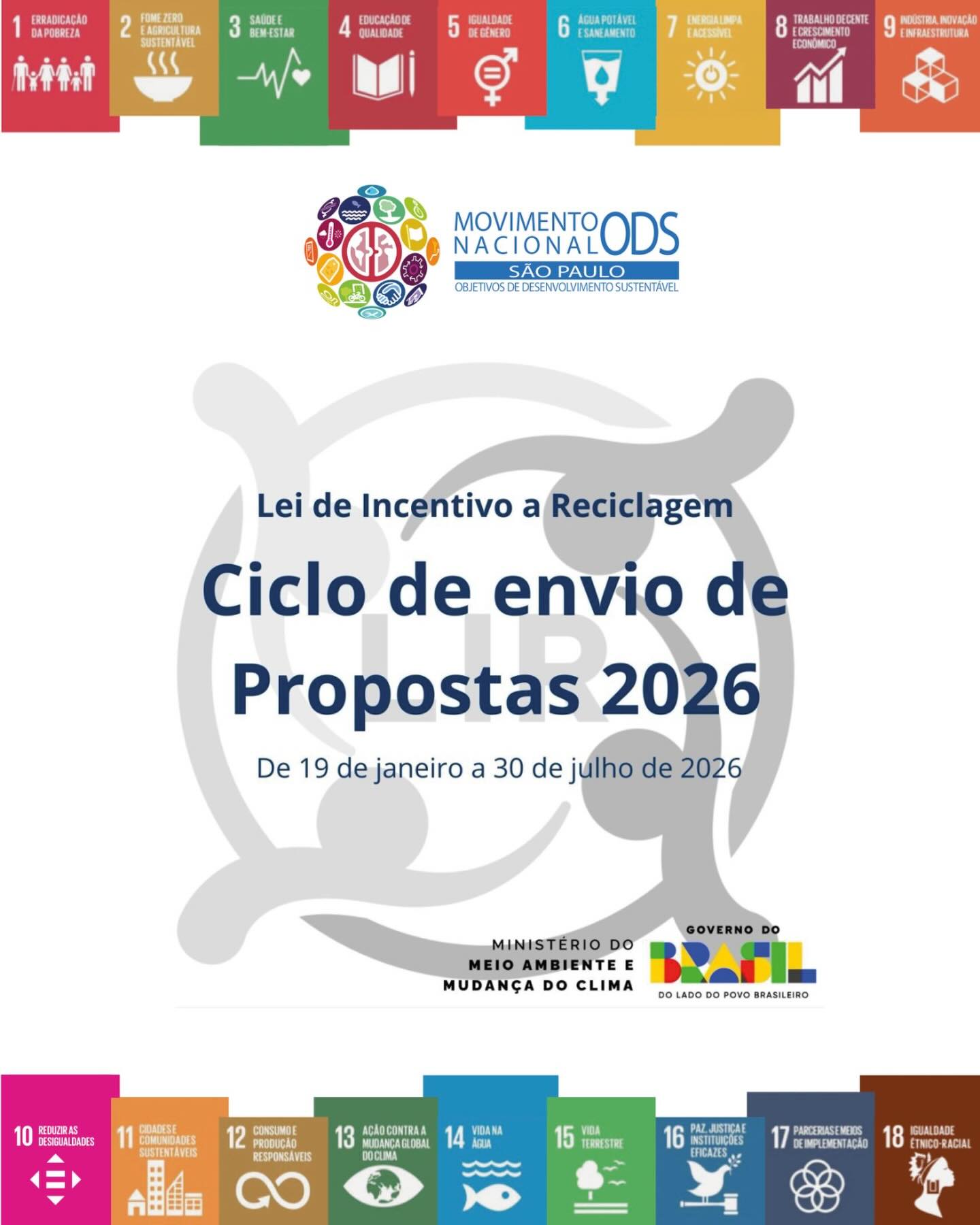 A Lei de Incentivo à Reciclagem (LIR) – Ciclo de Envio de Propostas 2026 está com inscrições abertas entre 19 de janeiro e 30 de julho de 2026, conforme anúncio do Ministério do Meio Ambiente e Mudança do Clima (MMA). O instrumento federal tem como objetivo fomentar projetos voltados à reciclagem, economia circular, inclusão social e sustentabilidade, por meio de incentivo fiscal.