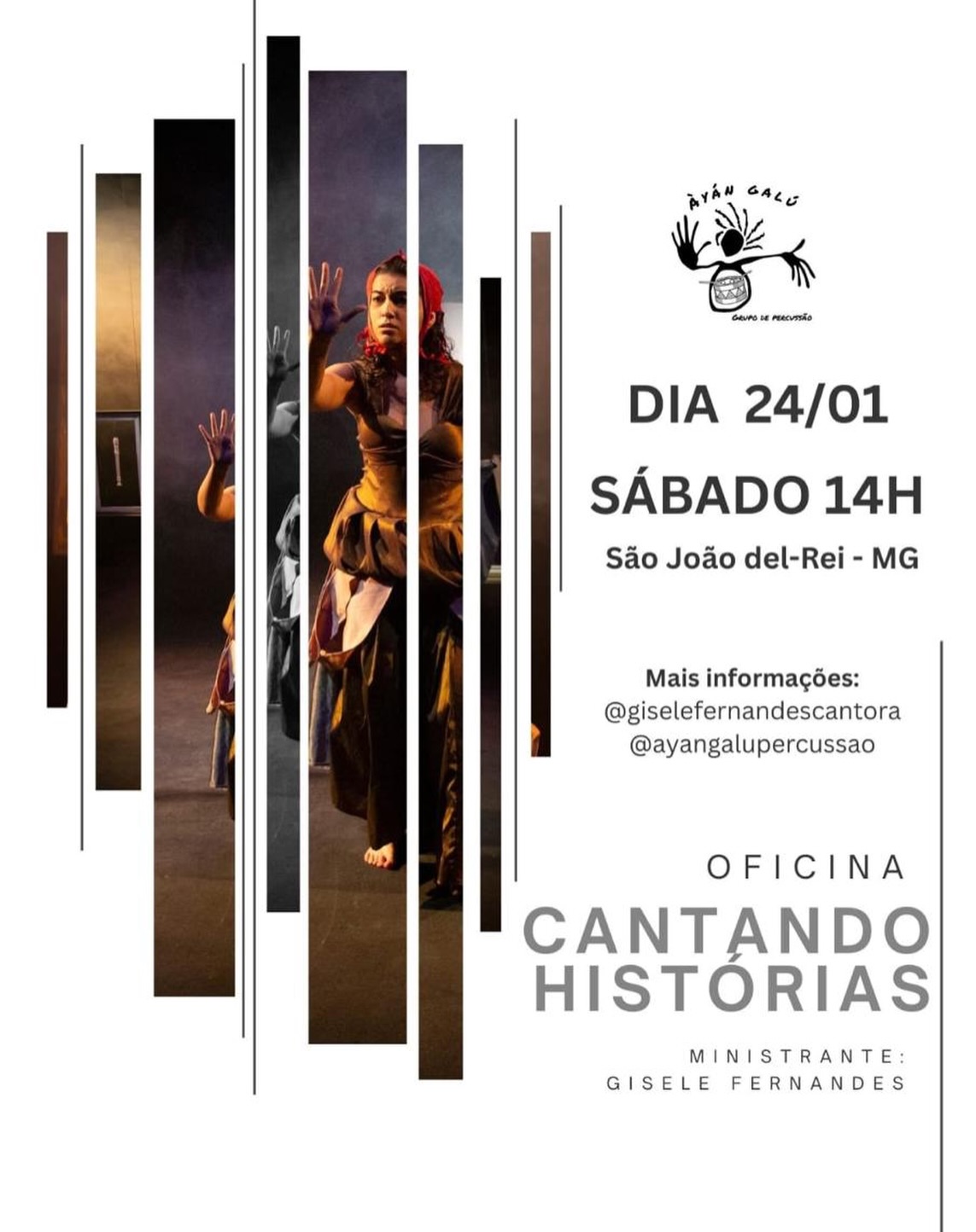 A oficina “Cantando Histórias” será realizada em 24 de janeiro (sábado), às 14h, em São João del-Rei (MG). A atividade tem como proposta o desenvolvimento da interpretação vocal e corporal aplicada à canção, articulando música, texto e presença cênica em um trabalho voltado à expressividade do cantor-ator.