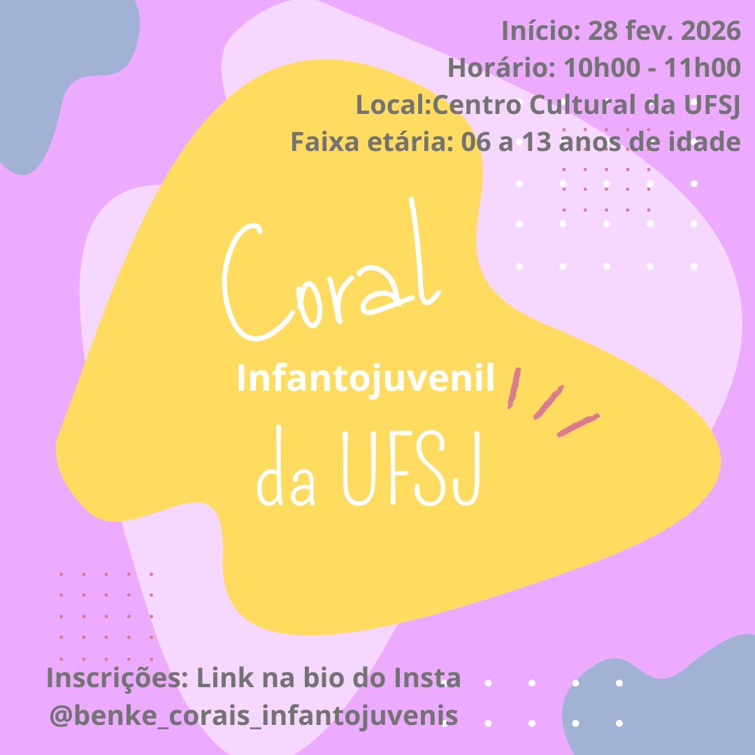 O Coral Infantojuvenil da UFSJ é uma atividade musical voltada para crianças e adolescentes de 6 a 13 anos, com início das atividades em 28 de fevereiro de 2026, no horário das 10h às 11h, no Centro Cultural da UFSJ, em São João del-Rei. A ação integra o Programa Benke: Corais Infantojuvenis da UFSJ – Ano VIII, desenvolvido pela Universidade Federal de São João del-Rei.