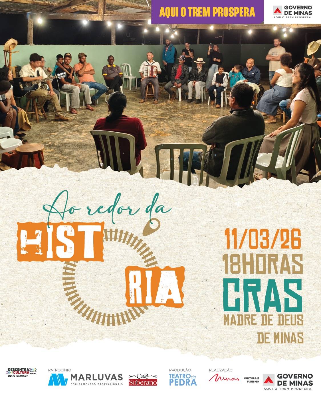 O espetáculo “Ao redor da história” será apresentado no dia 11 de março, às 18h, no CRAS de Madre de Deus de Minas. A montagem integra a programação cultural do município e propõe uma experiência teatral voltada ao público local, reforçando a presença das artes cênicas em equipamentos culturais e sociais da cidade.