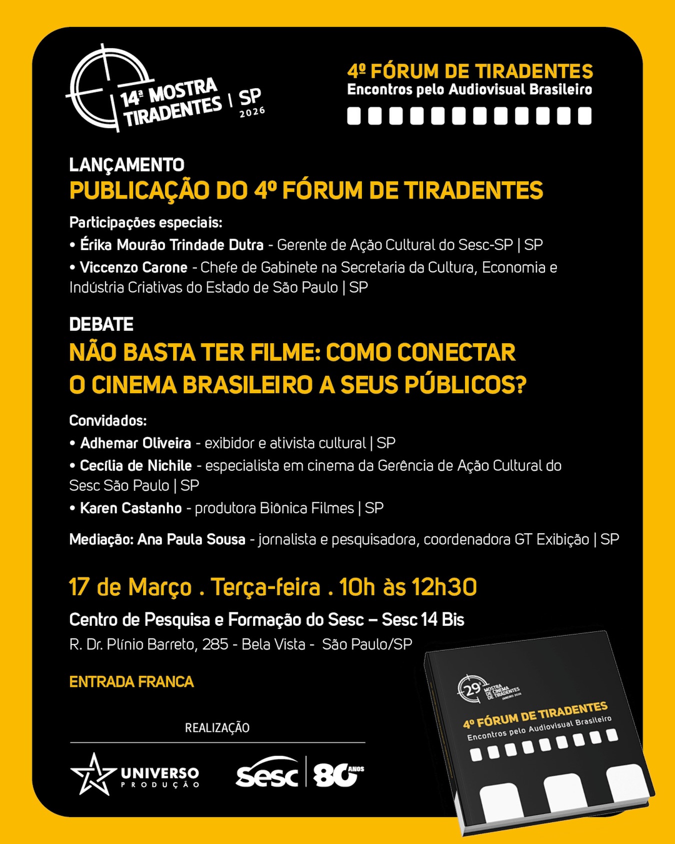 A publicação sistematiza discussões sobre o cenário contemporâneo do audiovisual brasileiro, com enfoque nas políticas culturais, circulação de obras e formação de público. O encontro contará com participações especiais de Érika Mourão Trindade Dutra, gerente de Ação Cultural do Sesc São Paulo, e Viccenzo Carone, chefe de gabinete da Secretaria da Cultura, Economia e Indústria Criativas do Estado de São Paulo.