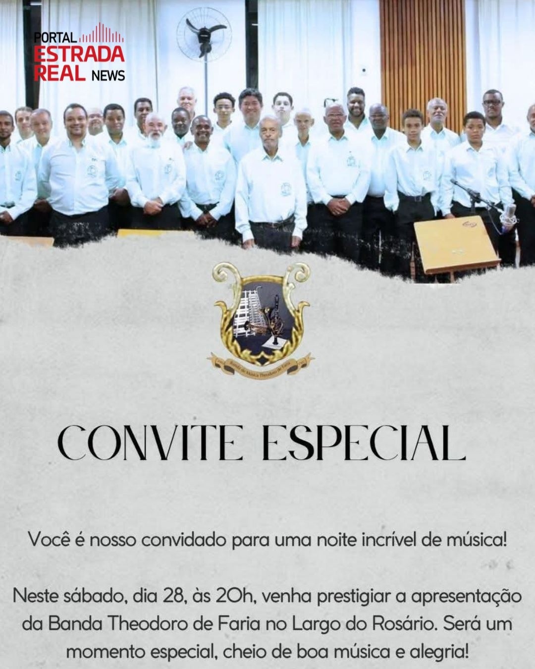 A apresentação da Banda Theodoro de Faria acontece no dia 28 de março de 2026, às 20h, no Largo do Rosário, em São João del-Rei. O evento integra a programação cultural da cidade e propõe uma atividade musical em espaço público, aberta à comunidade e visitantes.