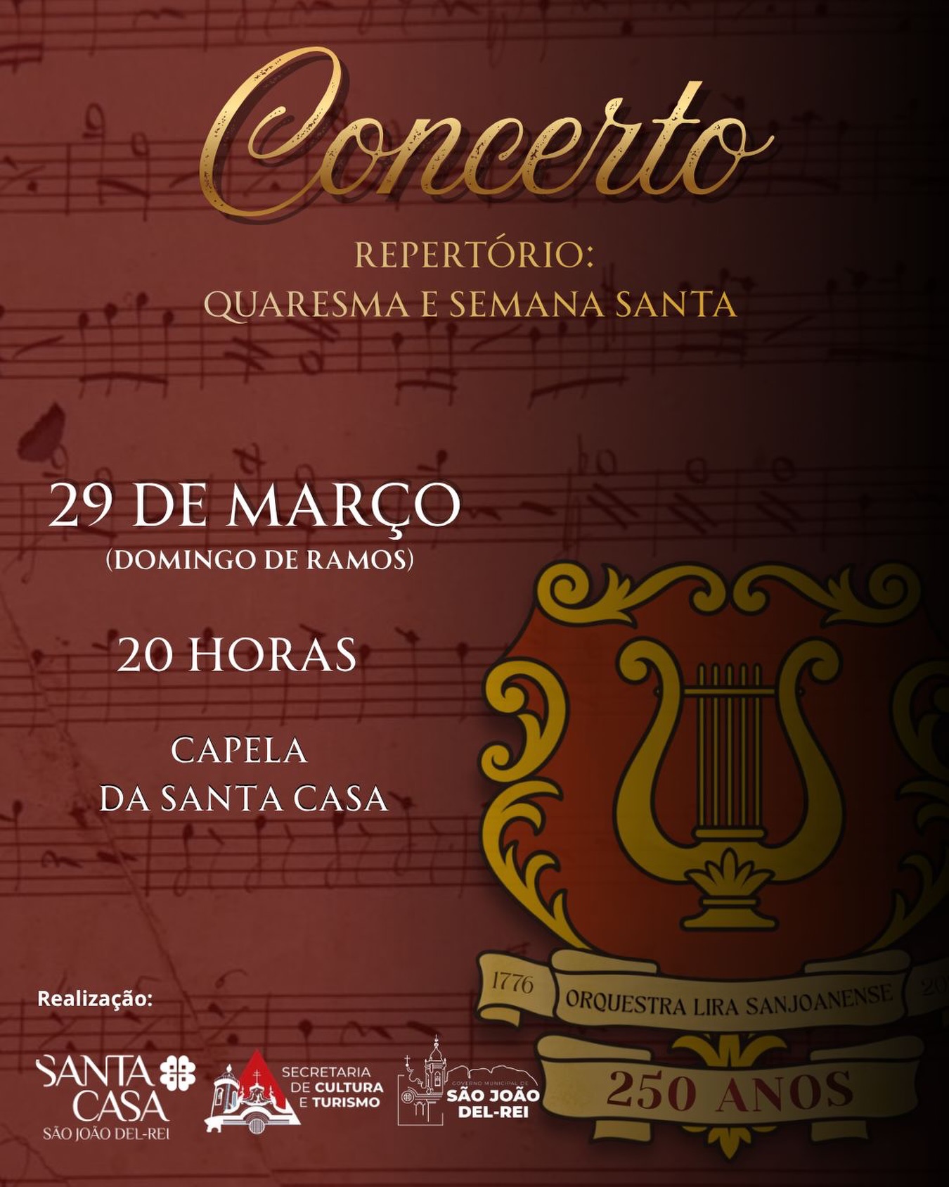 O Concerto da Orquestra Lira Sanjoanense – Repertório de Quaresma e Semana Santa será realizado no dia 29 de março de 2026 (Domingo de Ramos), às 20h, na Capela da Santa Casa, em São João del-Rei (MG). A apresentação é promovida pela Orquestra Lira Sanjoanense em parceria com a Secretaria de Cultura do município, com entrada gratuita.