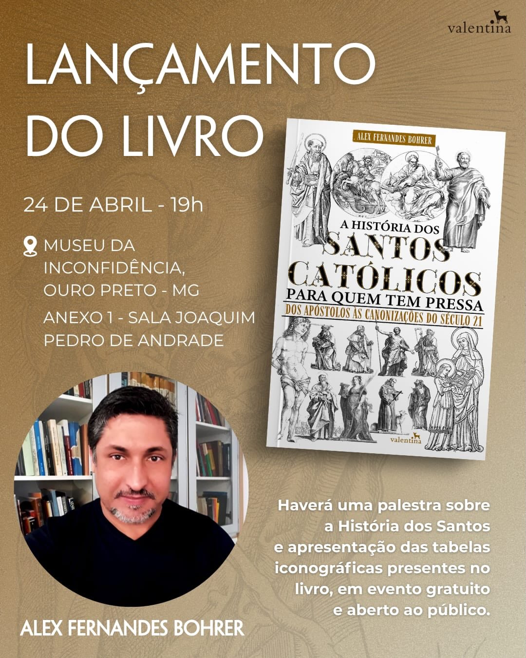 O lançamento do livro “A História dos Santos Católicos para Quem Tem Pressa”, de Alex Fernandes Bohrer, será realizado no dia 24 de abril de 2026, às 19h, no Museu da Inconfidência, Anexo I – Sala Joaquim Pedro de Andrade, em Ouro Preto, Minas Gerais. O evento é gratuito e aberto ao público.