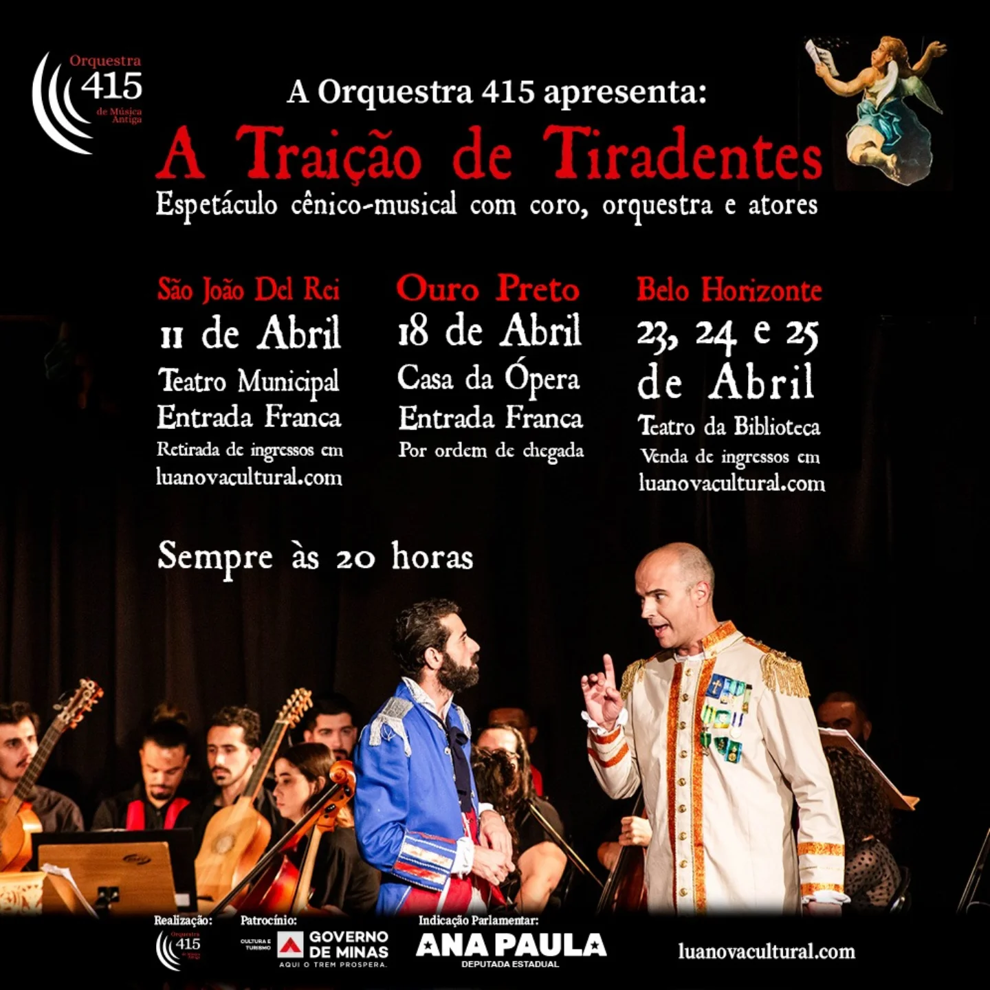 O espetáculo cênico-musical “A Traição de Tiradentes” será apresentado pela Orquestra 415 no dia 11 de abril de 2026, às 20h, no Teatro Municipal, em São João del-Rei. A apresentação integra uma pequena turnê de estreia da temporada e terá entrada gratuita, com retirada de ingressos na portaria.