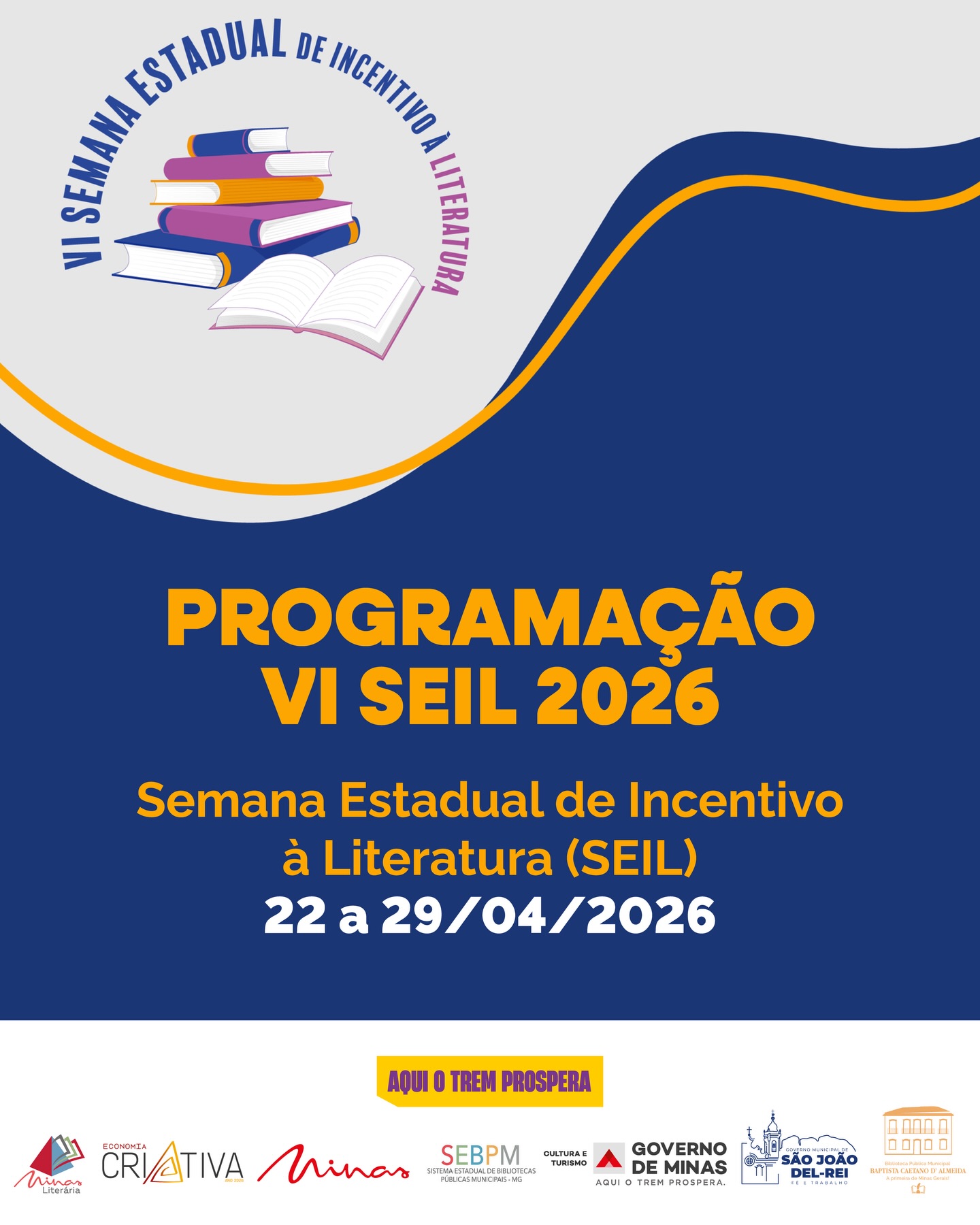 A VI Semana Estadual de Incentivo à Literatura (SEIL 2026) será realizada entre os dias 22 e 29 de abril de 2026, na Biblioteca Pública Municipal Baptista Caetano d’Almeida, em São João del-Rei (MG). A iniciativa integra uma mobilização estadual voltada à promoção do livro, da leitura e da formação de leitores, com atividades destinadas aos públicos infantil, infantojuvenil e adulto.