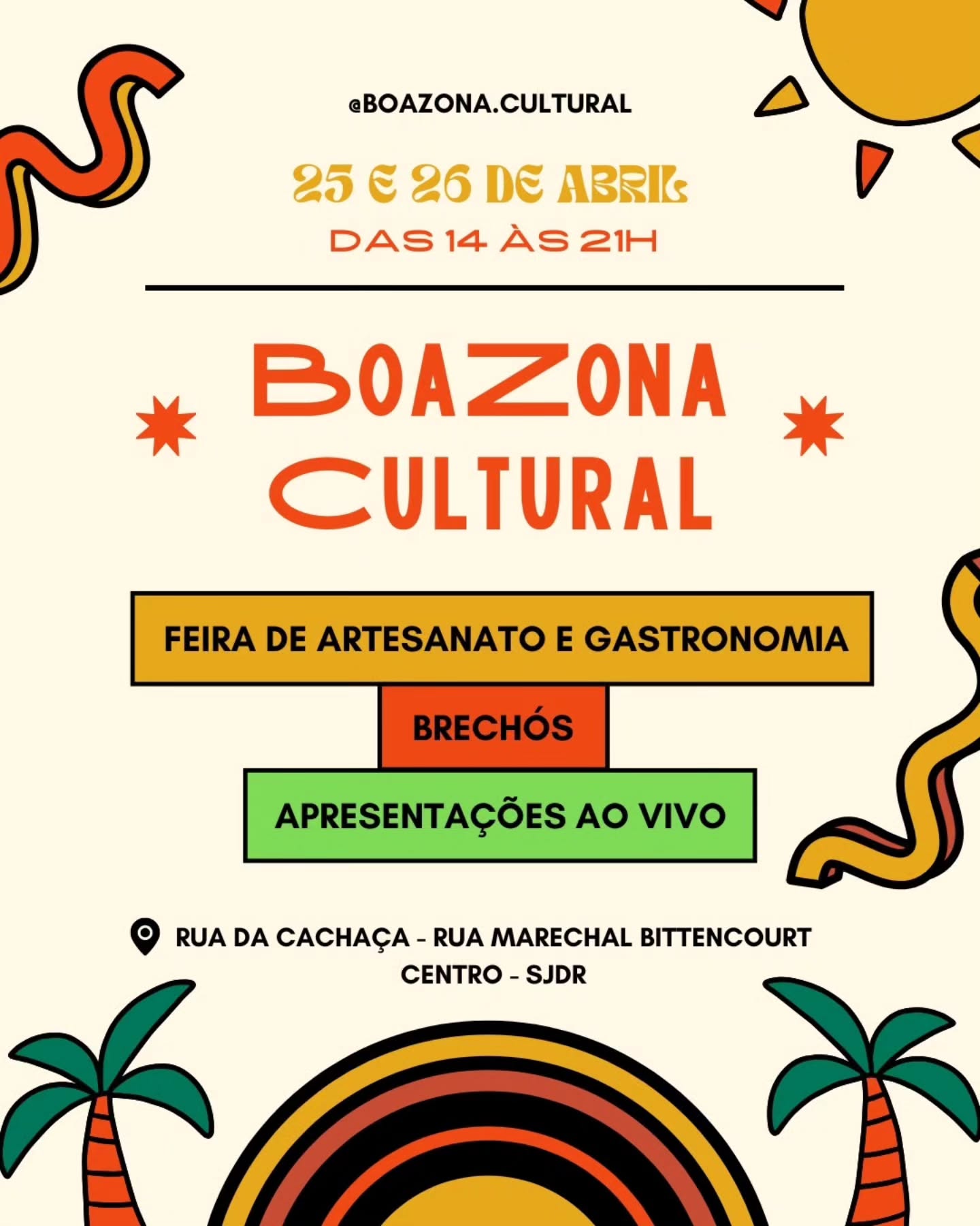A Boazona Cultural será realizada nos dias 25 e 26 de abril de 2026 (sábado e domingo), das 14h às 21h, na Rua da Cachaça, em São João del-Rei (MG). O evento reúne atividades culturais abertas ao público, com foco na valorização da produção artística local, convivência comunitária e ocupação de espaços urbanos.