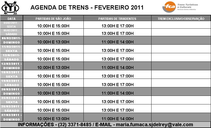 Passeio de Trem . São João del-Rei - Tiradentes . Agenda de circulação de Fevereiro