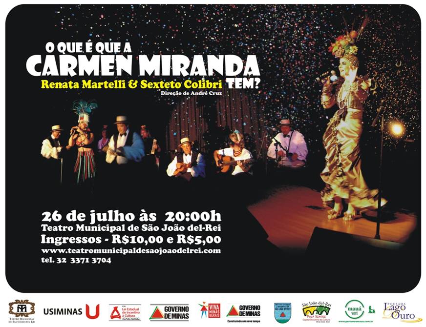 "O que é que a baiana tem?". Quem nunca ouviu o refrão dessa música imortalizada por Carmen Miranda? Com o intuito de comemorar os 100 anos de nascimento e mostrar esses e outros sucessos da pequena notável que Renata Martelli e Sexteto Colibri interpretarão neste domingo, 26, o espetáculo "O que é que Carmen Miranda tem?" no Teatro Municipal de São João del Rei, às 20h.