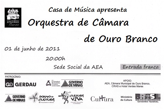 Dando continuidade a programação dos 10 anos da Casa de Música, a Orquestra Câmara de Ouro Branco estará se apresentando nesta quarta feira, dia 01 de junho, as 20:00, na sede social da AEA.