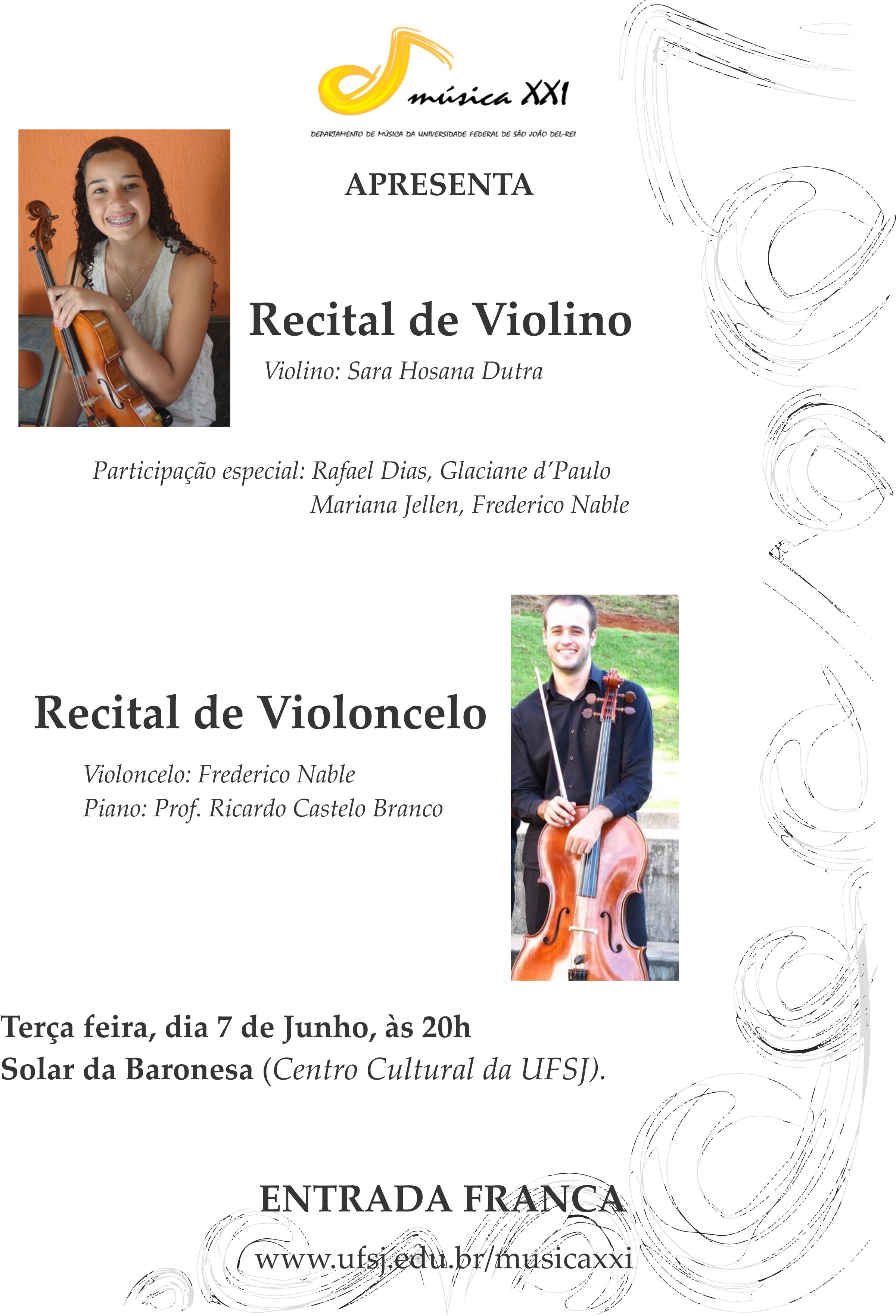 Nesta terça-feira, dia 7 de junho, às 20h, a série Terça no Solar apresenta, no Solar da Baronesa, mais ganhadores do Concurso Música XXI. A violinista Sara Dutra apresentará a Partita II para violino solo (Allemanda, Corrente, Giga) de J.S.Bach e o primeiro movimento do Concerto para violino em Sol maior de J. Haydn, acompanhada pelo quarteto de cordas: Rafael Dias Belo e Glaciane d’Paulo (violino), profa. Mariana Jelen (viola) e Frederico Nable (violoncelo). O violoncelista Frederico Nable apresentará a Pequena suíte para violoncelo e piano de H. Villa-Lobos e a Sonata op. 69 para violoncelo e piano de L. van Beethoven, acompanhado pelo pianista prof. Ricardo Castelo Branco. Entrada franca!