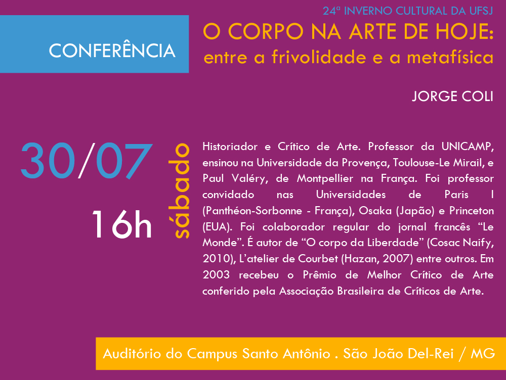 Conferência . O corpo na arte de hoje: entre a frivolidade e a metafísica . 24º Inverno Cultural da UFSJ