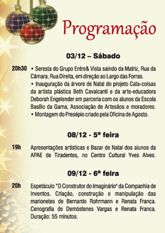 Tiradentes em festa . Comemorações de fim de ano com apresentações artísticas, teatrais e musicais, bazar de Natal, rua de lazer, etc. 3 a 31 de Dezembro
