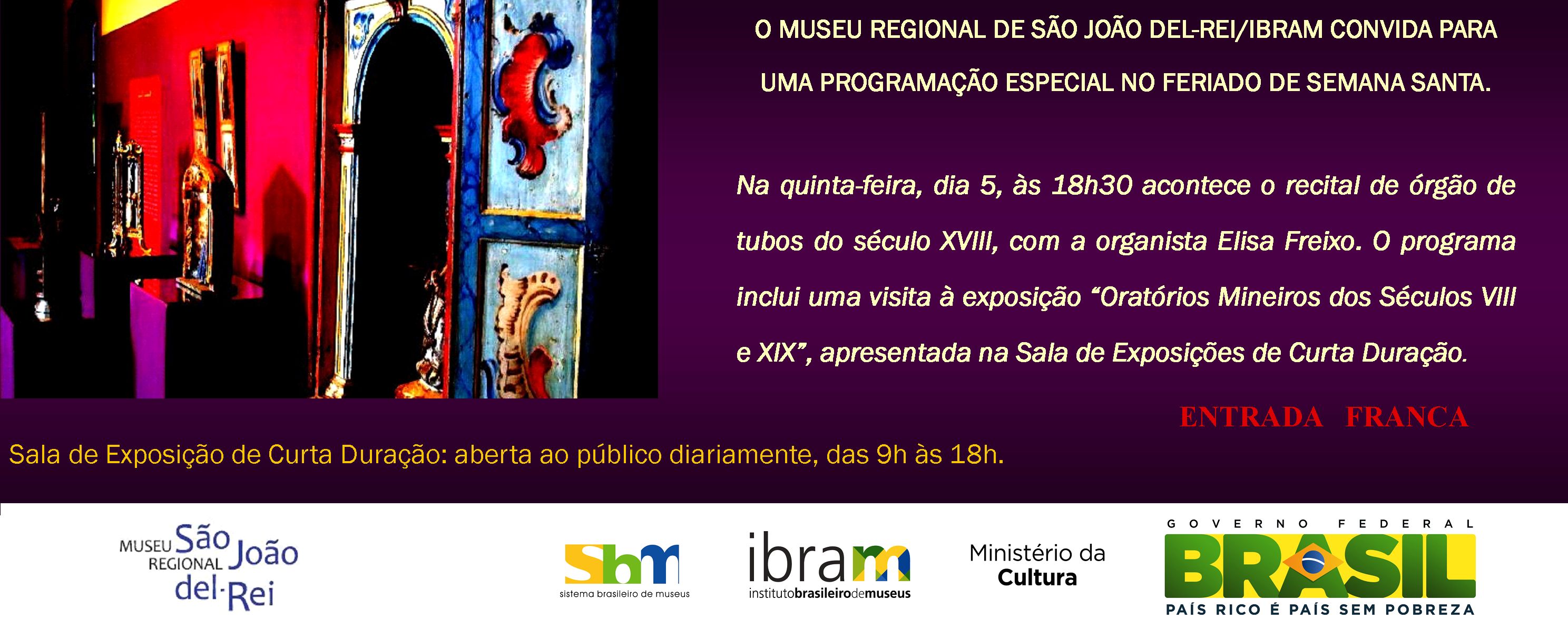 O programa inclui, também, uma visita à exposição “Oratórios Mineiros dos Séculos XVIII e XIX”, apresentada pelo Museu Regional de São João del-Rei/IBRAM, na Sala de Exposições de Curta Duração.