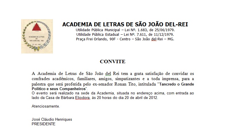 Academia de Letras de São João del-Rei . Palestra "Tacredo, o Grande Político e seus Companheiros"