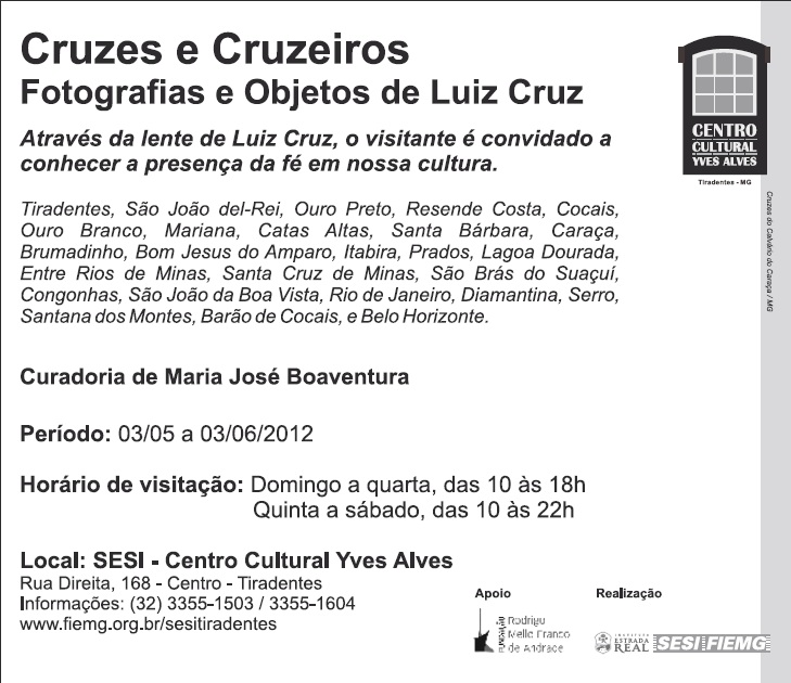 Tiradentes é palco de uma mostra de fotos de cruzes e cruzeiros que marcam a cultura de Minas e de cidades como Rio de Janeiro. Acontece no município, até o dia 3 de junho, no Centro Cultural Yves Alves, a Exposição Cruzes e Cruzeiros, que conta com objetos artesanais de escultores de Tiradentes e fotografias de Luiz Cruz. Nos últimos dois anos o fotógrafo percorreu municípios como São João del-Rei, Ouro Preto, Resende Costa, Cocais, Ouro Branco, Mariana, Santa Bárbara, Brumadinho, Rio de Janeiro, Itabira, Santa Cruz de Minas, Catas Altas, Diamantina, Barão de Cocais, entre muitas outras que, segundo Cruz, trazem fortemente o traço da cultura e religiosidade através desses objetos.