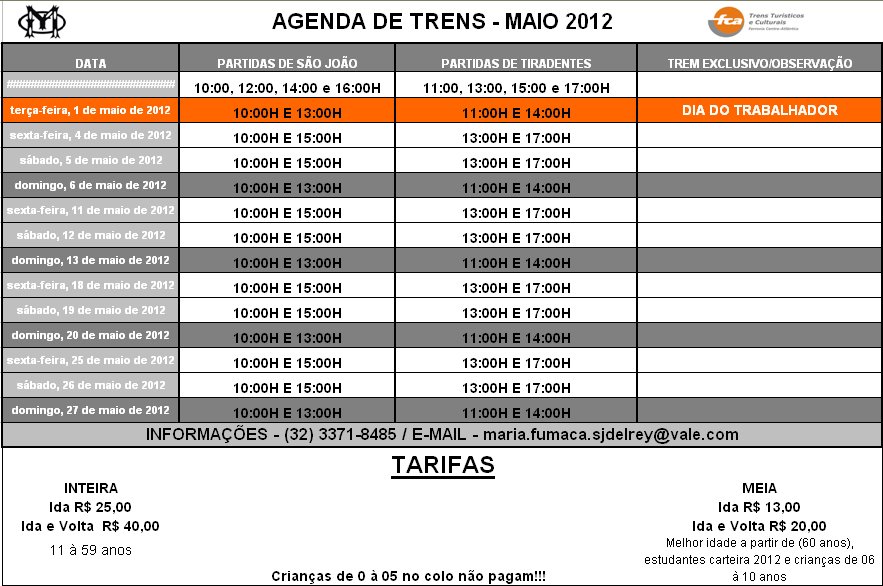 Passeio de Trem . SJDR/Tiradentes . Agenda de Circulação Maio/2012