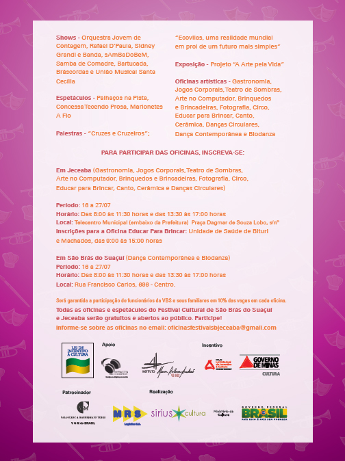 Festival Cultural de São Brás do Suaçuí e Jaceaba . 16 a 27 de Julho