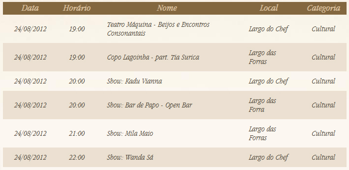 página inicial | livro ser nobre é ter identidade | rede colaborativa pró-agenda 2030 Agenda Cultural XV Festival Cultura e Gastronomia Tiradentes . Programação 24 de Agosto . Teatro, shows e Copo Lagoinha Data 24/08/2012 Cidade Tiradentes Descrição Veja programação completa Compartilhar no Facebook Compartilhar no Instagram Compartilhar no Whatsapp Imprimir