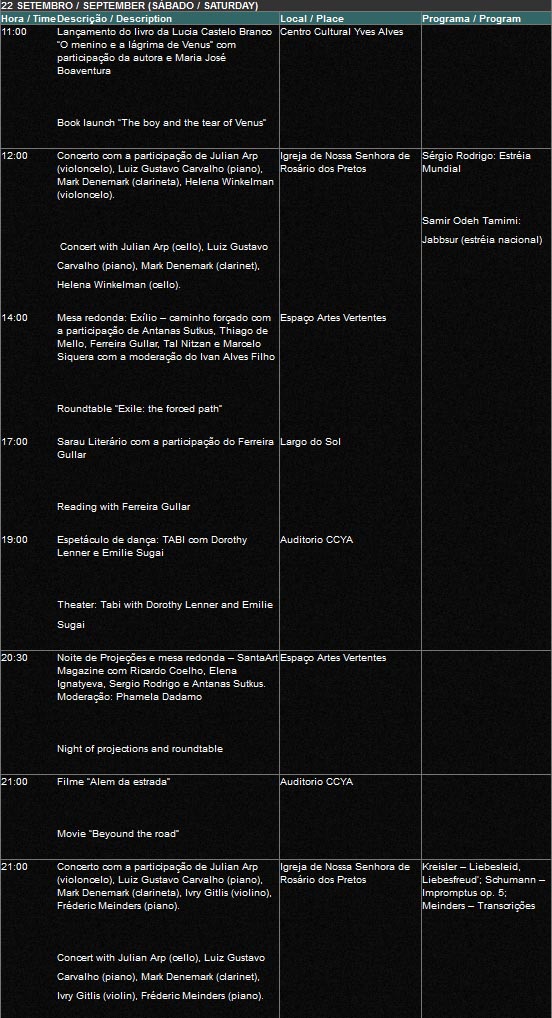 página inicial | livro ser nobre é ter identidade | rede colaborativa pró-agenda 2030 Agenda Cultural 1º Festival Internacional de Artes de Tiradentes . Programação de 22 de Setembro . Lançamentos, concertos, mesas redondas, sarau, espetáculo de dança e filme Data 22/09/2012 Cidade SJDR Descrição Saiba mais sobre o Festival e confira a programação completa Compartilhar no Facebook Compartilhar no Instagram Compartilhar no Whatsapp Imprimir