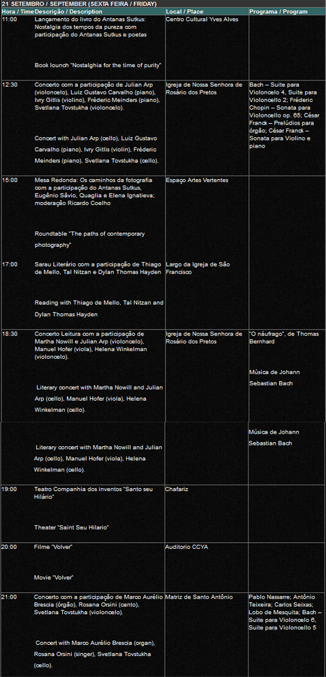1º Festival Internacional de Artes de Tiradentes . Programação de 21 de Setembro . Lançamentos, concertos, mesas redondas, sarau, teatro e filme