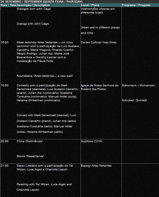 1º Festival Internacional de Artes de Tiradentes . Programação de 20 de Setembro . mesa redonda, diálogos, concerto, sarau e filme