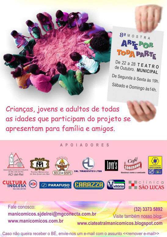 A Cia. Teatral ManiCômicos promove a partir desta segunda-feira, 22, a 8ª edição da Mostra Arte por Toda Parte. O evento levará crianças, jovens e adultos assistidos por projeto artístico da trupe ao palco do Teatro Municipal de São João del-Rei. Ao todo, 32 espetáculos se revezarão sob os holofotes do espaço até o dia 28, todos desenvolvidos pelos próprios educandos em escolas e comunidades são-joanenses, de Lagoa Dourada, Resende Costa, Madre de Deus de Minas, Perdões, Ibituruna, Ritápolis, São Tiago, Barroso, Dores de Campos e São Sebastião da Vitória. A entrada para as peças será gratuita e as apresentações acontecerão de segunda a sexta, às 19h; e no sábado e no domingo, às 14h. Outras informações pelo telefone (0**32) 3373-5892.