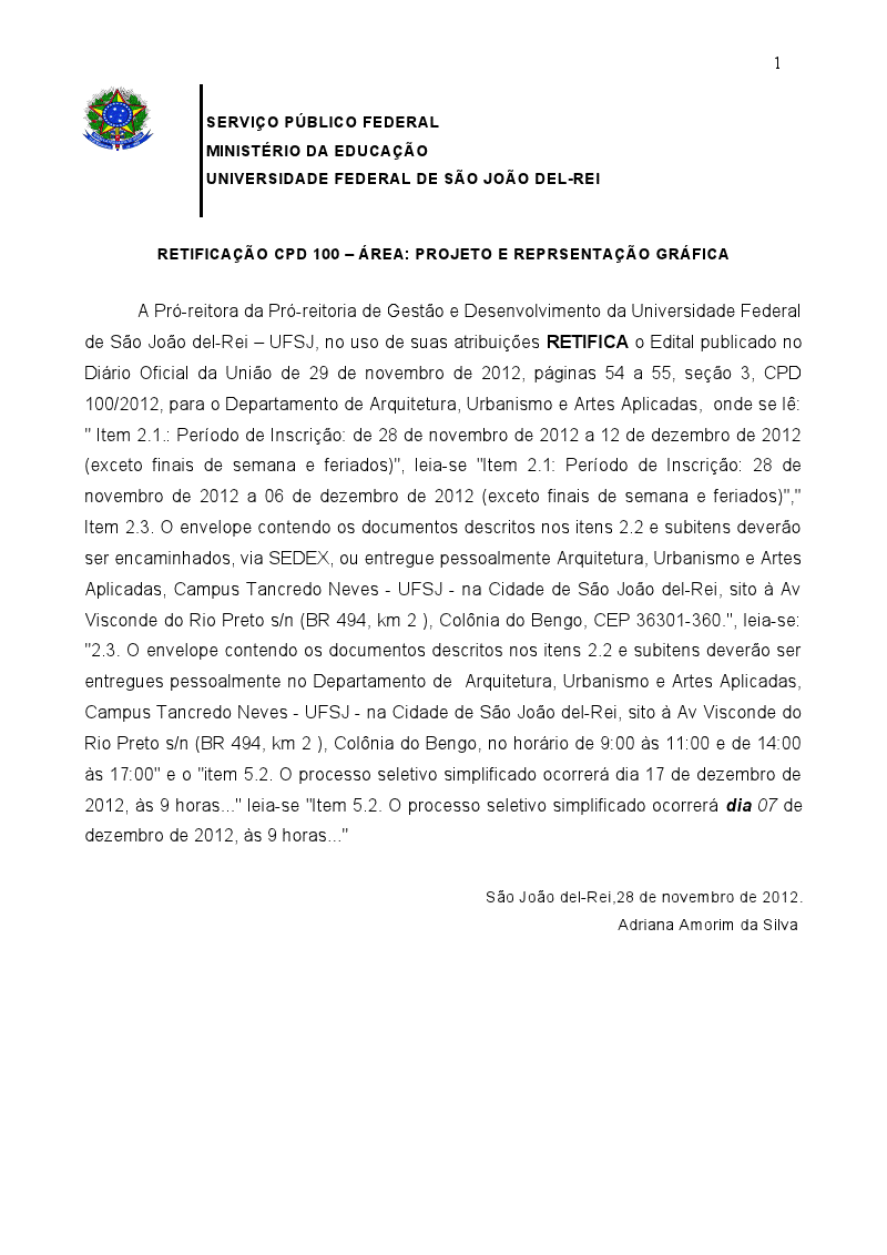 Edital do concurso (e sua retificação), que oferece 3 vagas para Professor Substituto aqui na UFSJ, para área de Projeto e Representação Gráfica. Como é para professor substituto, não há exigência de qualificação/pós-graduação. Conta a experiência profissional e o conhecimento de arquitetura.
