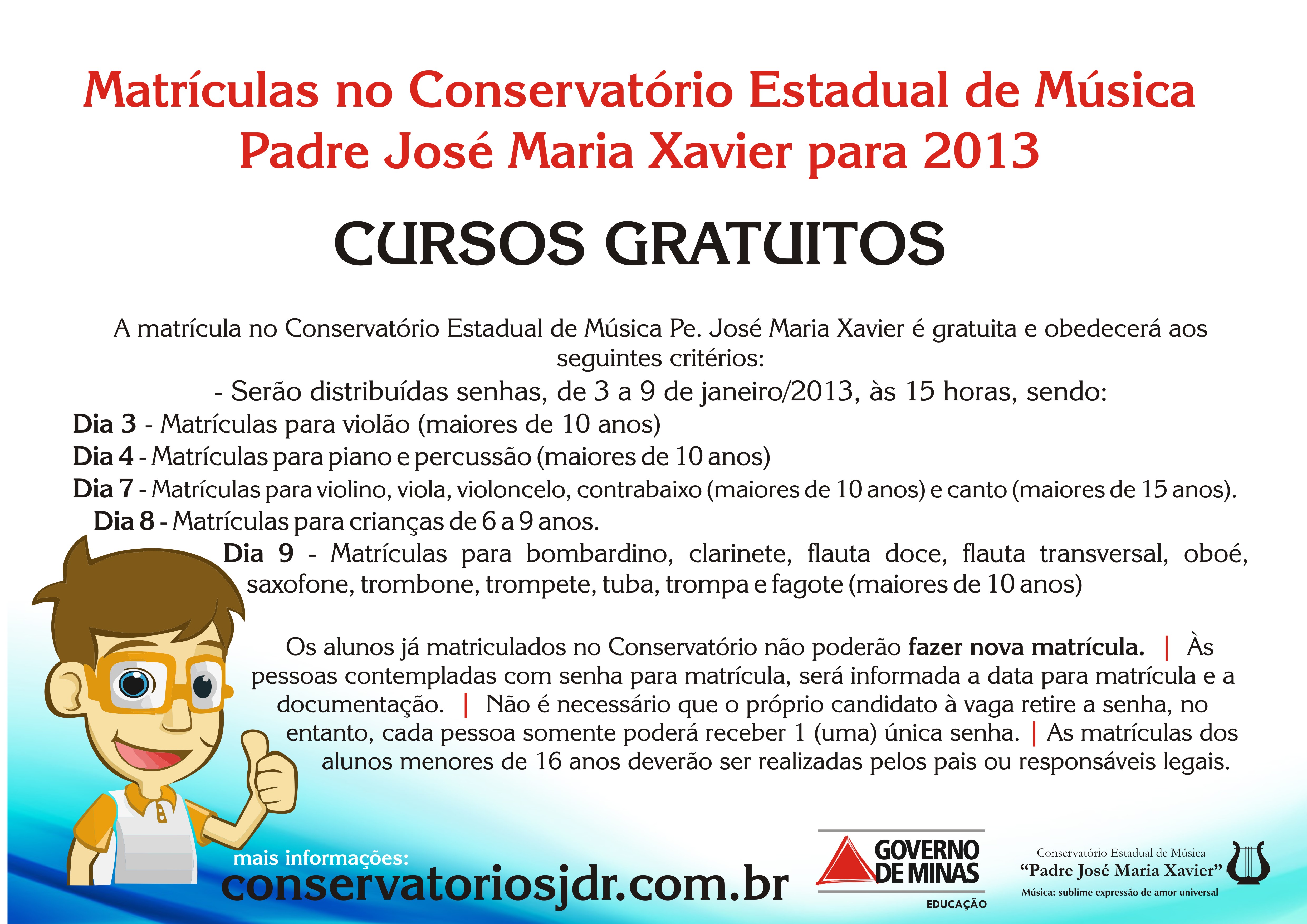 Conservatório E. de Música Pe. José Maria Xavier . Matrículas abertas . 3 a 9 de Janeiro