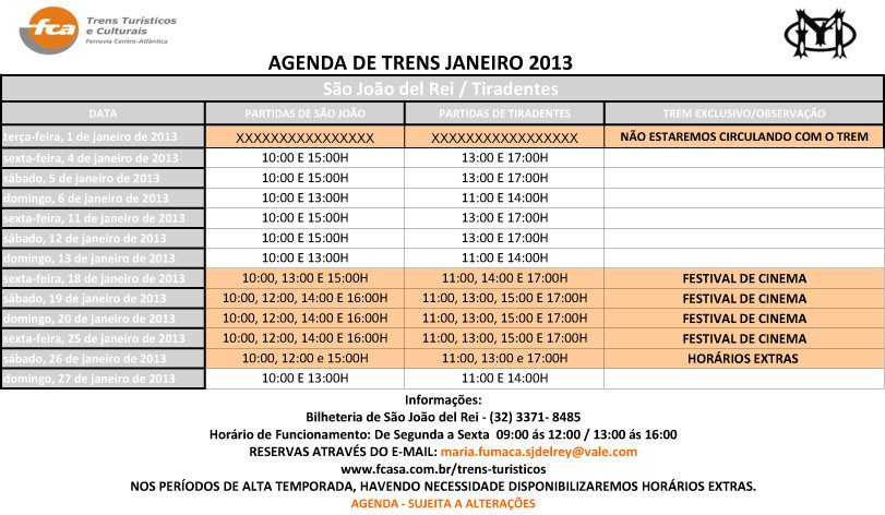 Passeio de Maria Fumaça . Agenda de Janeiro