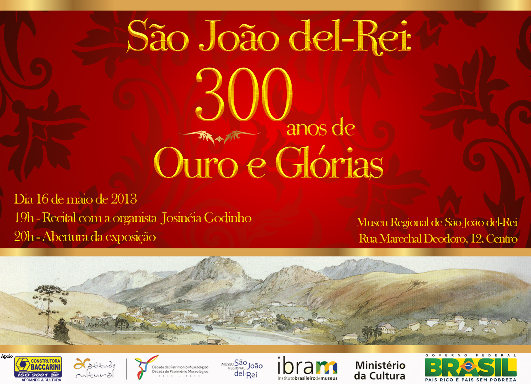 No dia 08 de dezembro de 2013 a cidade de São João del-Rei comemora 300 anos de sua criação. Pensando nisso O Museu Regional de São João del-Rei/IBRAM idealizou a mostra São João del-Rei: 300 anos de Ouro e Glórias que será inaugurada, no próximo dia 16 de maio, às 20hs.