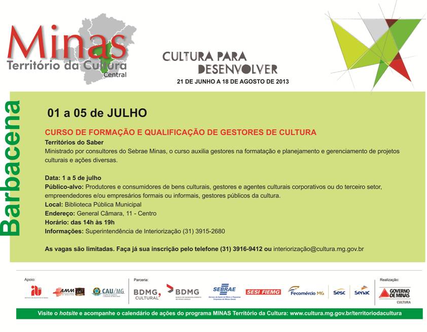 página inicial | livro ser nobre é ter identidade | rede colaborativa pró-agenda 2030 Agenda Cultural 1º Curso de Formação e Qualificação de Gestores de Cultura . Até 5 de Julho Data 01/07/2013 Cidade Barbacena Descrição Fonte: Minas Território da Cultura Compartilhar no Facebook Compartilhar no Instagram Compartilhar no Whatsapp Imprimir
