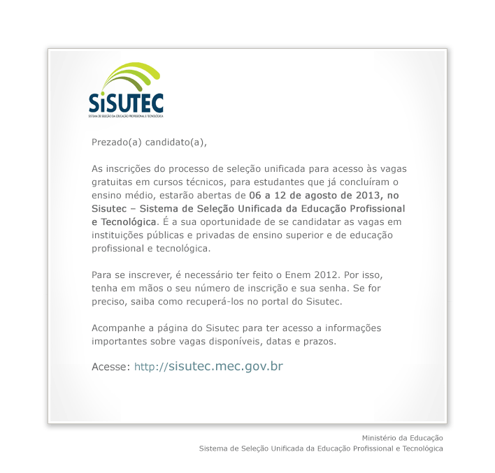 Sistema de Seleção Unificada da educação Profissional - Sisutec . Inscrições até 12 de Agosto de 2013