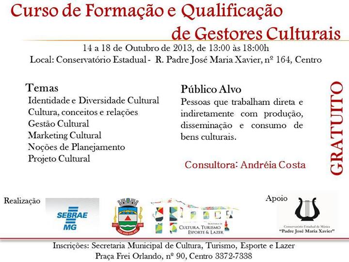 Estão abertas as inscrições para o Curso de Formação e Qualificação de Gestores Culturais que acontecerá de 14 a 18 de outubro, no Conservatório Estadual de Música. Inscrições na Secretaria de Cultura, Turismo, Esporte e Lazer de São João del Rei!