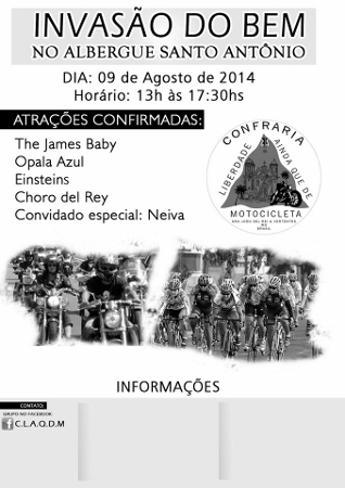Segue a primeira versão do banner, convidando os motociclistas, aficcionados e nosso companheiros ciclístas para a "Invasão do Bem no Albergue Santo Antônio" (bairro Dom Bosco, perto da Igreja, aqui em São João del Rei/MG).