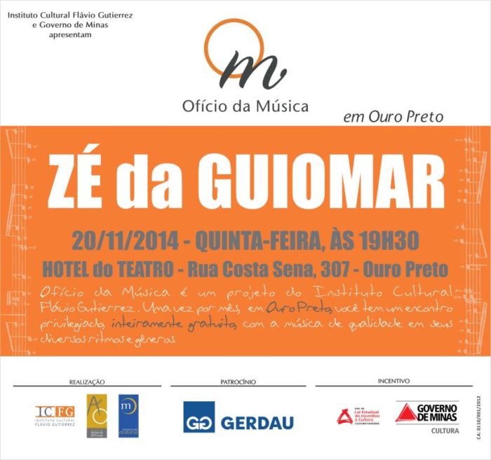 O Museu de Artes e Ofícios (MAO) promove mais uma edição do projeto “Ofício da Música”, em Ouro Preto, sob a curadoria de Poti Castro, recebendo o tradicional grupo de samba Zé da Guiomar. No encontro, o quarteto, considerado um dos mais bem sucedidos no cenário musical da noite de Belo Horizonte, apresenta o que há de melhor no samba com inserções de bossa nova e outras tendências. O evento ocorre no dia 20 de novembro, quinta-feira, às 19h30, no Hotel do Teatro (Rua Costa Sena, 307, Ouro Preto). O projeto tem patrocínio da Gerdau.