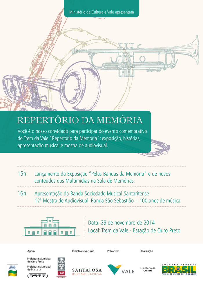 O Trem da Vale está em festa: no dia 29 de novembro, sábado, a partir das 15 horas, será promovido o evento Repertório da Memória. Na Sala de Memórias haverá a inauguração da exposição temporária Pelas bandas da memória, com abordagem histórica de bandas de música da região.