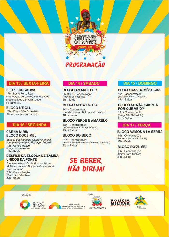 Carnaval 2015 . Santa Cruz de Minas . Programação Completa 13/02 a 17/02