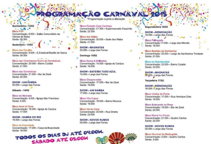 Carnaval 2015 . Tiradentes . Programação Completa 12/02 a 17/02