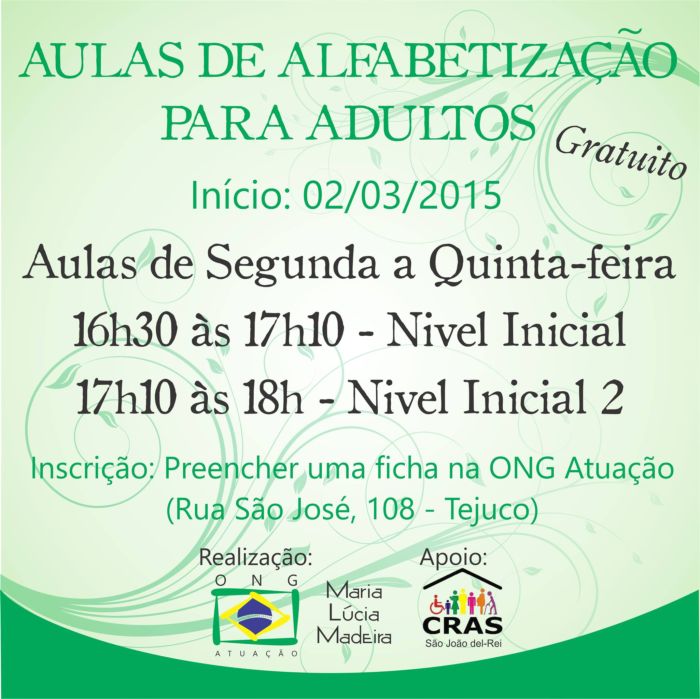Aulas de Alfabetização Para Adultos . Inscrições Abertas!