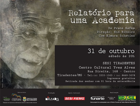 No dia 31/10 às 20h00 apresentaremos o espetáculo teatral Relatório Para Uma Academia. A peça é baseada na obra homônima de Franz Kafka e tem direção de Eid Ribeiro.