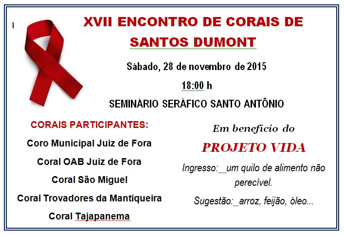 O coral Trovadores da Mantiqueira, sob a regência de frei Joel Postma o.f.m. e acompanhamento ao piano, fará sua apresentação no próximo sábado às 18 h no Seminário Seráfico dentro do XVII Encontro de Corais de Santos Dumont.