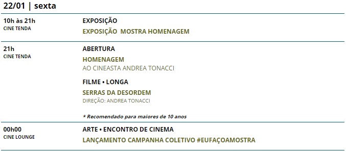 19ª Mostra de Cinema de Tiradentes . Programação completa do dia 22/01