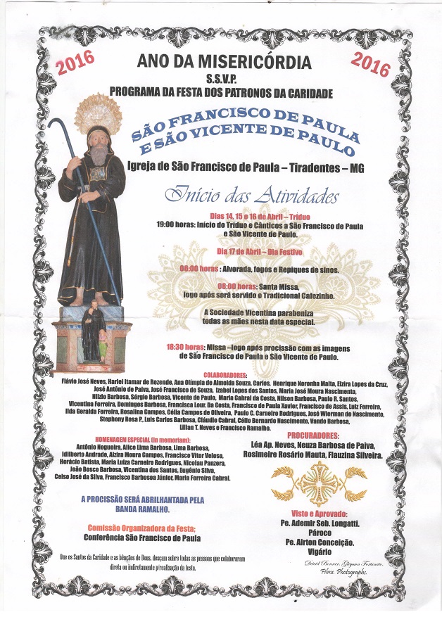 Festa dos Patronos da caridade: São Francisco de Paula e São Vicente de Paulo . De 14 a 17/04